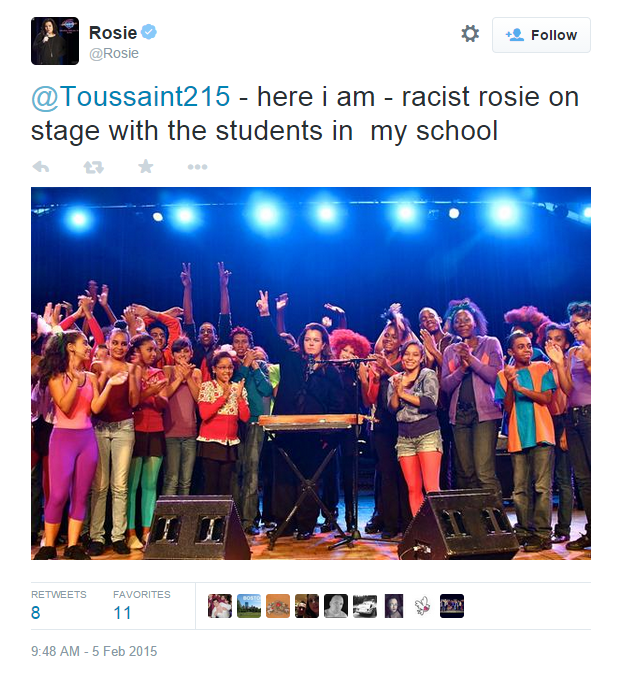 Not actually addressing the problem of Ensler’s work, Rosie jumps right to a photo of herself with her complete line of Black children Pokemon to prove how not racist she is. Because you know, standing next to Black people is the TRUE tool to dismantling white supremacist racism…