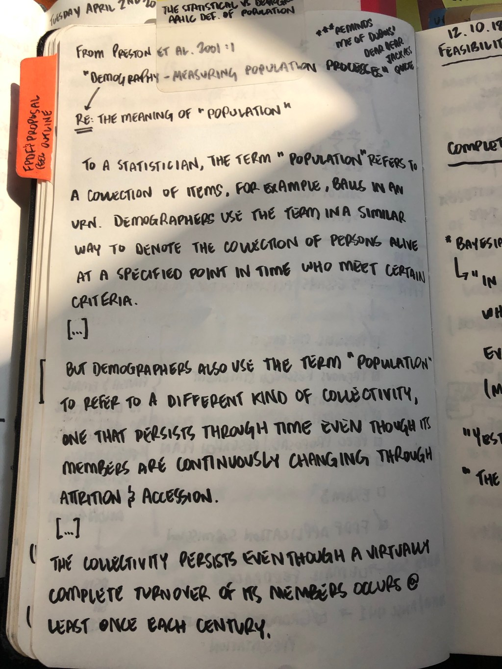 This article is short & informative about the abstract processes & assumptions involved in defining a population as a biological unit. One of the easier ways to make sense of this is to approach it from how statisticians define populations versus demographers. Below is a picture of one of my notebooks where I wrote down the definitions of population from Preston et al. (2001:1) “Demography – Measuring Population Processes”.
