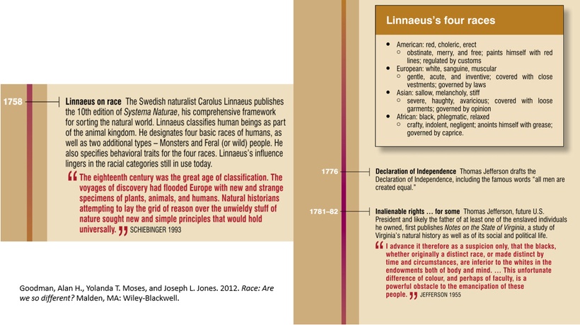 Schiebinger’s book shares much in common with Painter’s text, both uncover a series of dynamic events made up of coordinated & uncoordinated actions. For example, Painter discusses the nitty gritty detailed & contradictory history of the social constriction of whiteness. This detailed analysis takes the reader through the history of Art, Beauty, Anthropology, and the collective histories of Europe. Painter illustrates how beauty rather than discrete anthropometrics are what constructed our understandings of human populations, used as secondary justifications for enslavement like those made by Thomas Jefferson. Schiebinger, on the other hand, reviews the history of natural history & biology, specifically Schiebinger is interested in understanding the intersections of gender, sex, & race in the process of scientific knowledge production. For instance, Linneaus centers the naming of mammals on the possession of mammary glands or the interestingly hilarious fact that he also thought plants had sex on a marital bed. He even thought there were monsters amongst men and included these creatures in Systema Naturae.