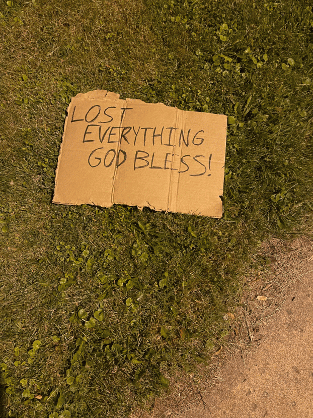 While on a walk, I stumbled across a cardboard sign that read “LOST EVERYTHING GOD BLESS!” laying in the grass at the corner of Lafayette avenue & Delaware avenue, “Billionaires Row” neighborhood, in Gates Circle, Buffalo, New York (West of Main Street). East of Main street is where ~ 85% of the Black people live. Buffalo, New York is the 6th most racially segregated cities in the settler America. What settler america calls Buffalo, NY is Tetiohosero:ken, occupied Tsonontowane’a:ka (Seneca) territory.