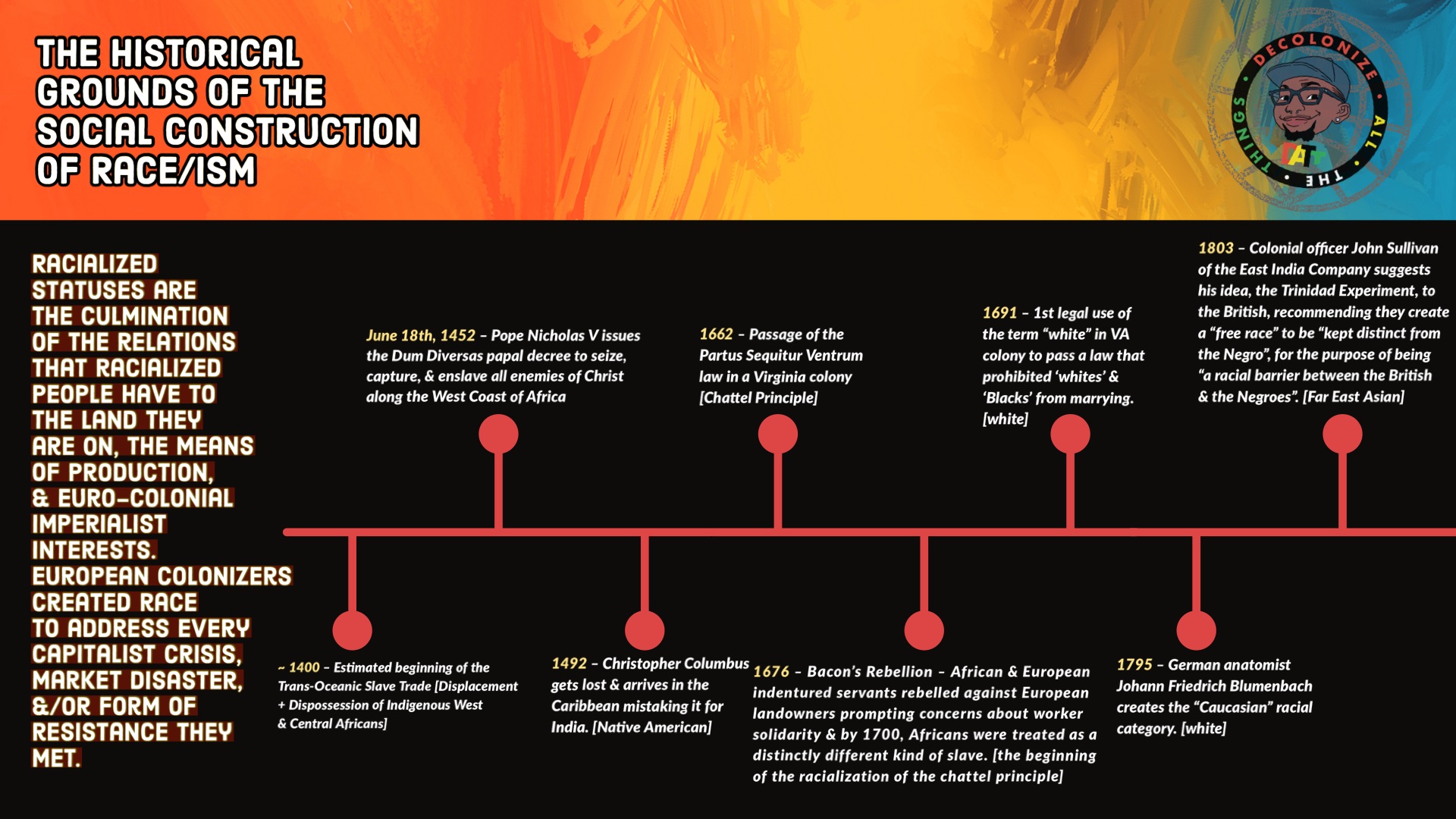 It was in 1662 that the Virginia colony in the Americas established partus sequiter ventrem, extending the free or chattel legal status of the mother to the child, extending slavery to all future matrilineal generations, in perpetuity (Sublette and Sublette 2016:135). At that time, ‘slave’ was not synonymous with African or Black, which began to rise in the 1650s in the colonies even during a time that European indentured servants were still being shipped to the West Indies (Wolfe 2016; Sublette and Sublette 2016). In 1691 there was the first legal use of ‘white’ when the Virginia colony enacted a law prohibiting the marriage between whites and Blacks (Goodman et al. 2012). We can keep following this path through the Civil War, the passage of the Black Codes during Reconstruction, the 15th Amendment, to the one-drop rule, and blood quantum. The point is that a ‘race’ is a political-economic grouping that serves political-economic functions and transforms its boundaries in different nations based on the interests of those in power (Roberts 2011). Later these political-economic relations transformed and were justified and framed as biological during the 18th century, and it was there that we began to see ‘race’ consolidate as the colonial system’s non-negotiable classificatory concept and organizing grammar of the 19th century. The order of these events is significant because what they reveal is ‘race’ is a political system regulating citizenship and labour. The problem of ‘race’ is a political, social, and economic one maintained through dynamic processes that reproduces the ideological justifications for Eurocolonial expansion and later a split labor market (Du Bois 1935; Bonacich 1972; Hill-Collins 2000). As sociologist Dorothy Roberts argues, “race is not a biological category that is politically charged. It is a political category that has been disguised as a biological one” (2011:4).
